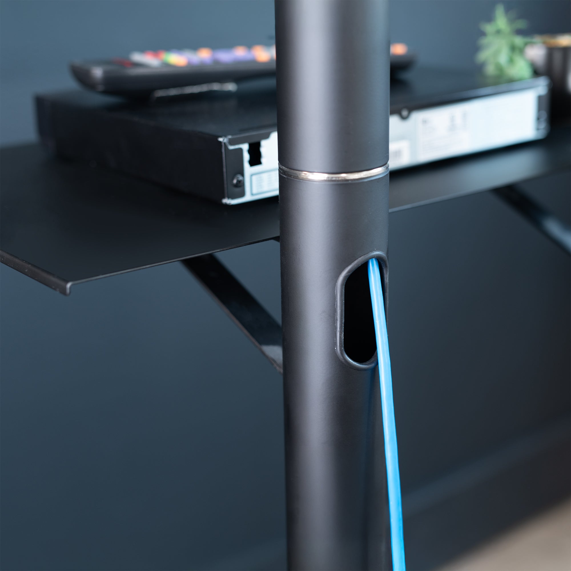 Cart features built-in cable channels inside the support poles and base, keeping cords organized and out of sight. Cables can be routed through access on the backside of the cart.