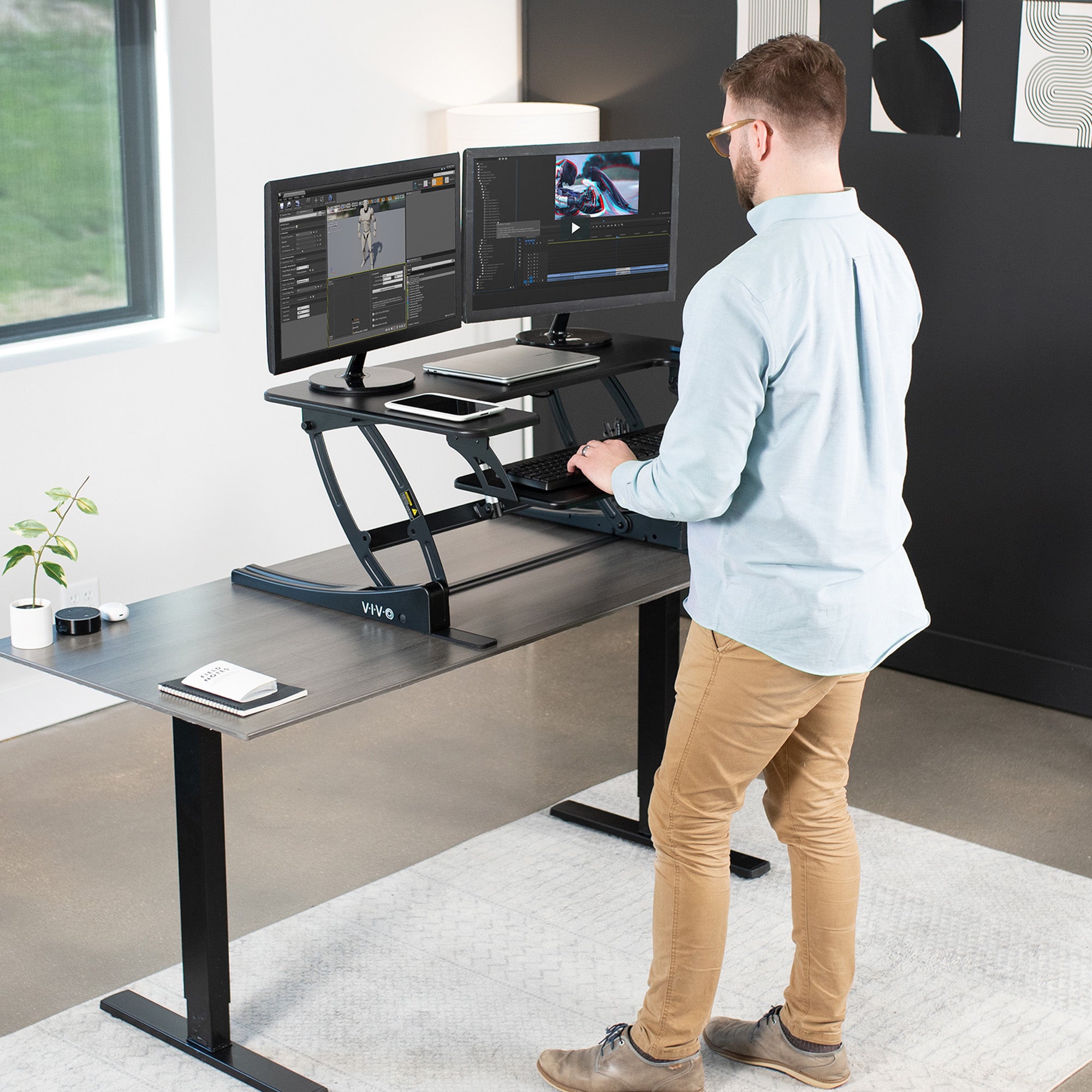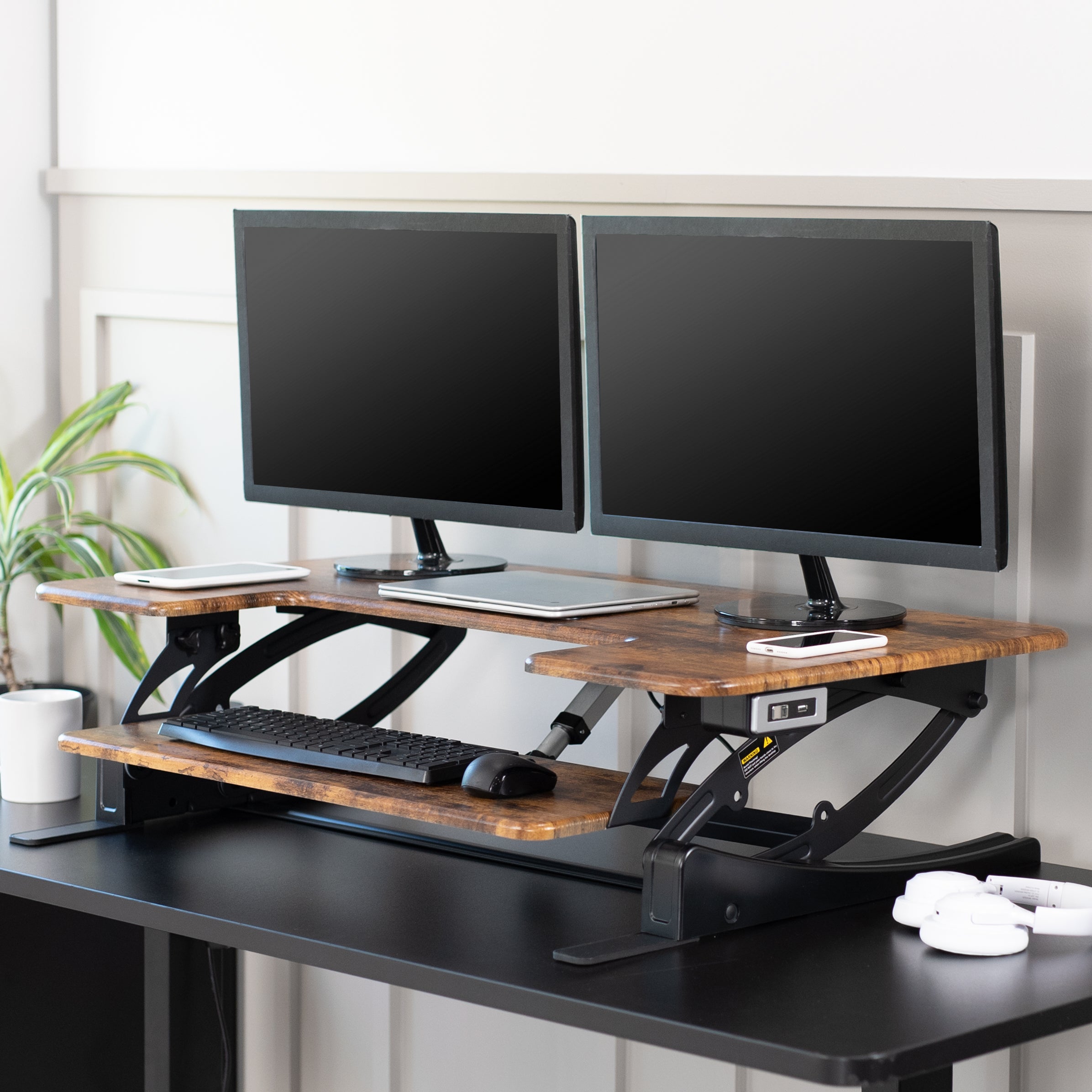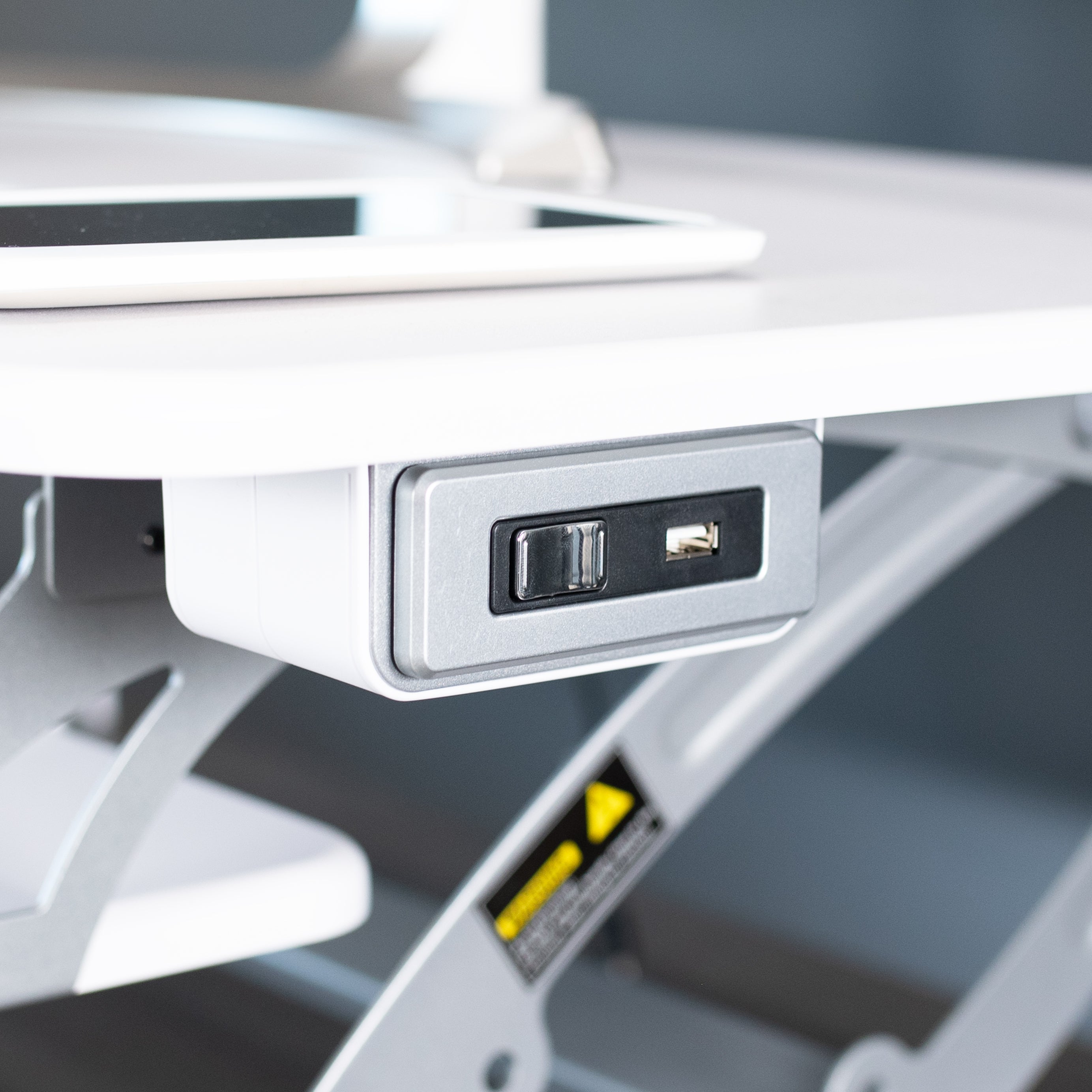 Improve your work experience with the extra-wide electric tabletop desk riser (DESK-V000VLE Series) from VIVO! This dual-tiered height adjustable desk sits on top of your current desk and gives you the benefit of standing or sitting throughout the long work day. This provides numerous health benefits for the body such as increased blood flow and reduced aches and pains. Featuring a powerful electric motor that provides a smooth transition with unlimited adjustment points from 6.4” to 16.7”, a non-skid base for excellent stability, and cable management clips for a clean and organized appearance, this desk riser is ready to perform! The elegant control panel also includes a USB port for convenient charging or syncing of devices at your work area. All necessary hardware and instructions are provided to get your new desk converter assembled and increasing work comfort in no time!